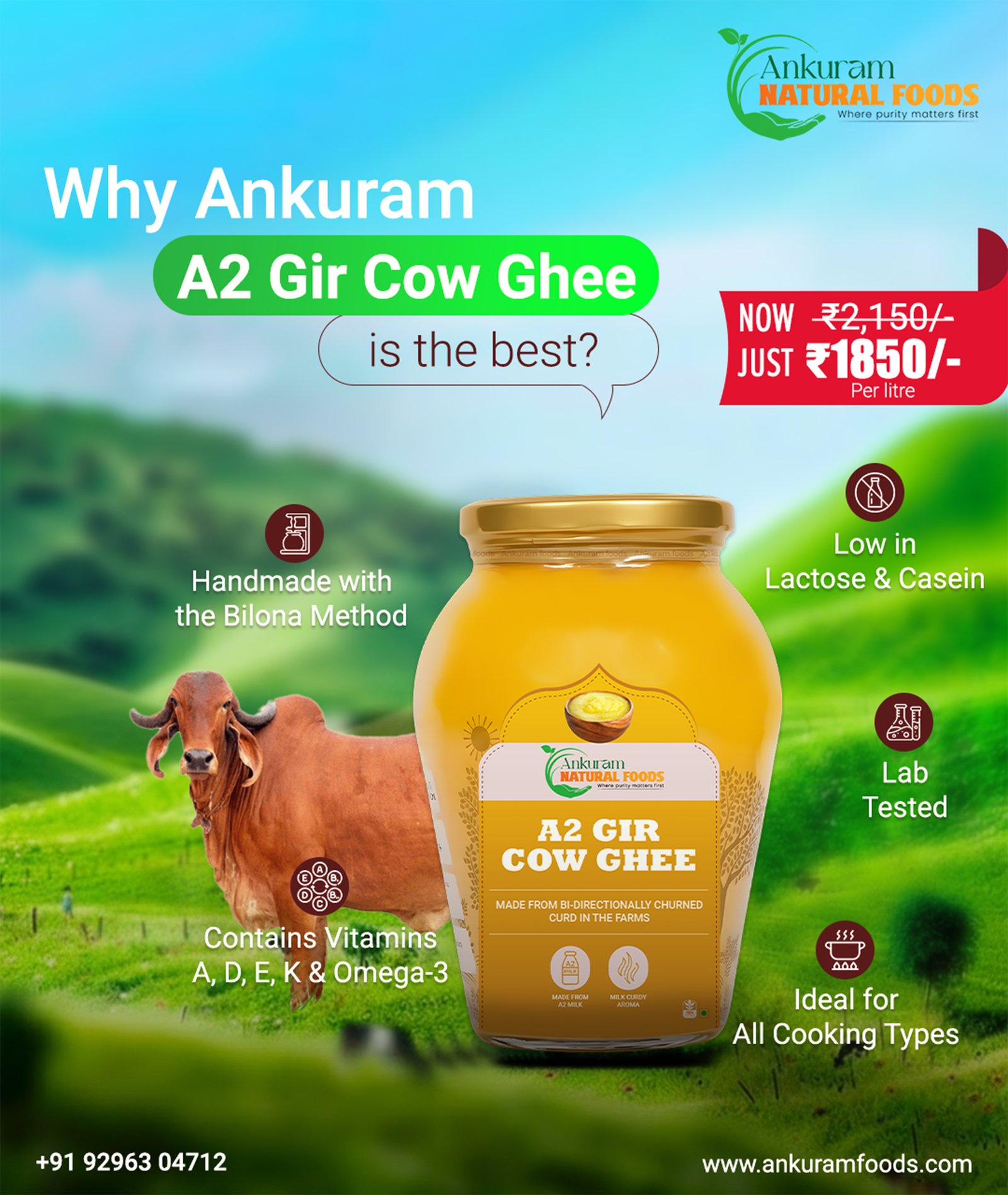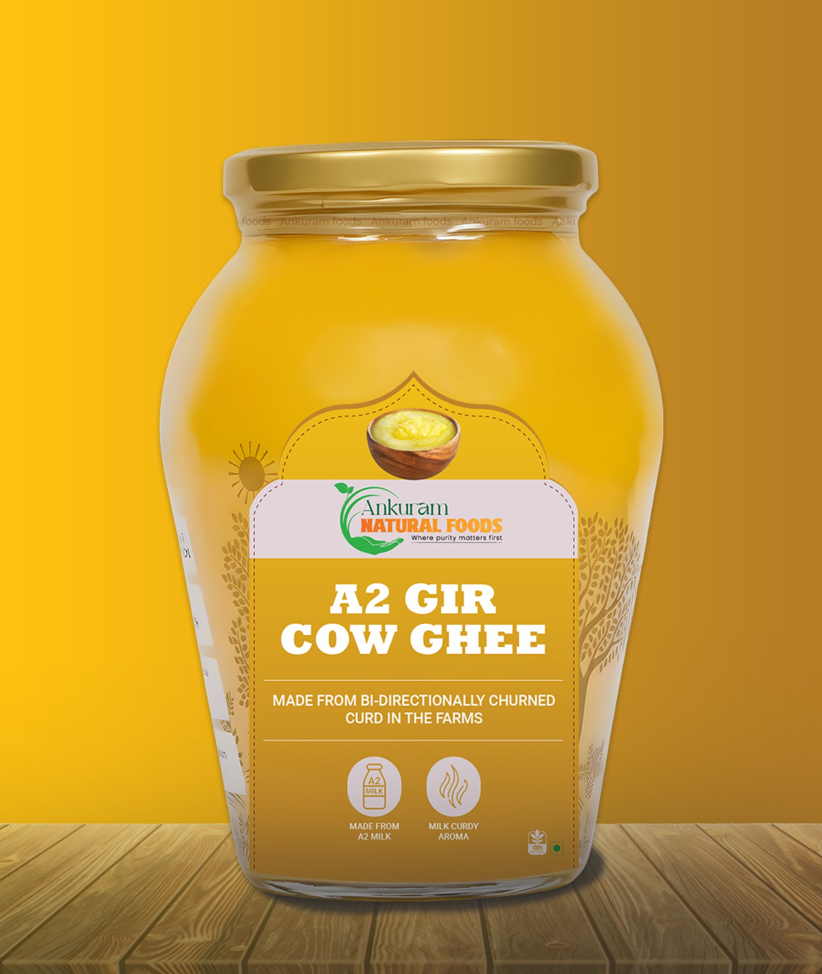 Experience the richness of purity with Ankuram Natural Foods A2 Gir Cow Ghee, made from the milk of pure-bred Gir cows through the traditional Bilona method. Our ghee is bi-directionally churned from curd, ensuring authentic taste, aroma, and nutrition—just like homemade ghee.